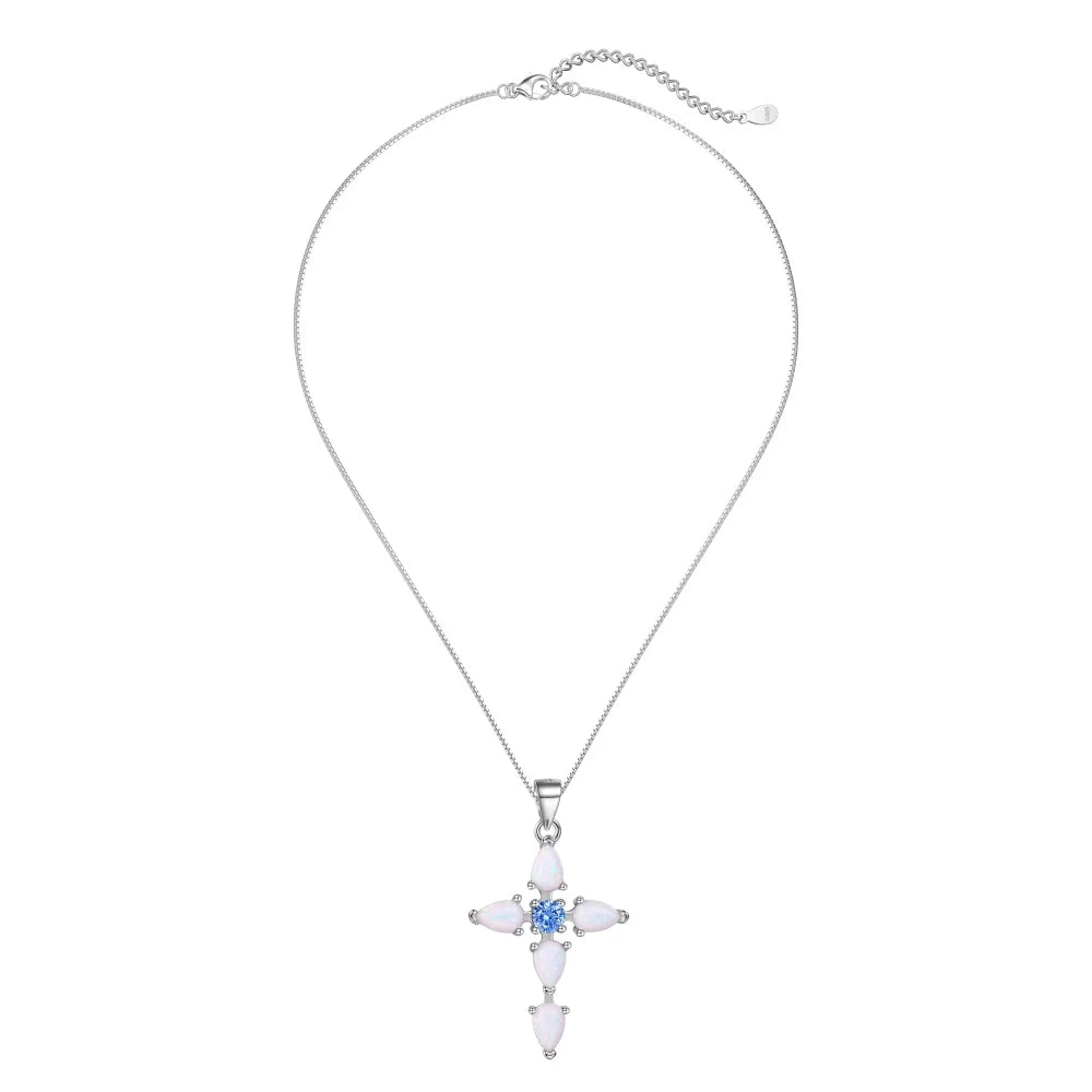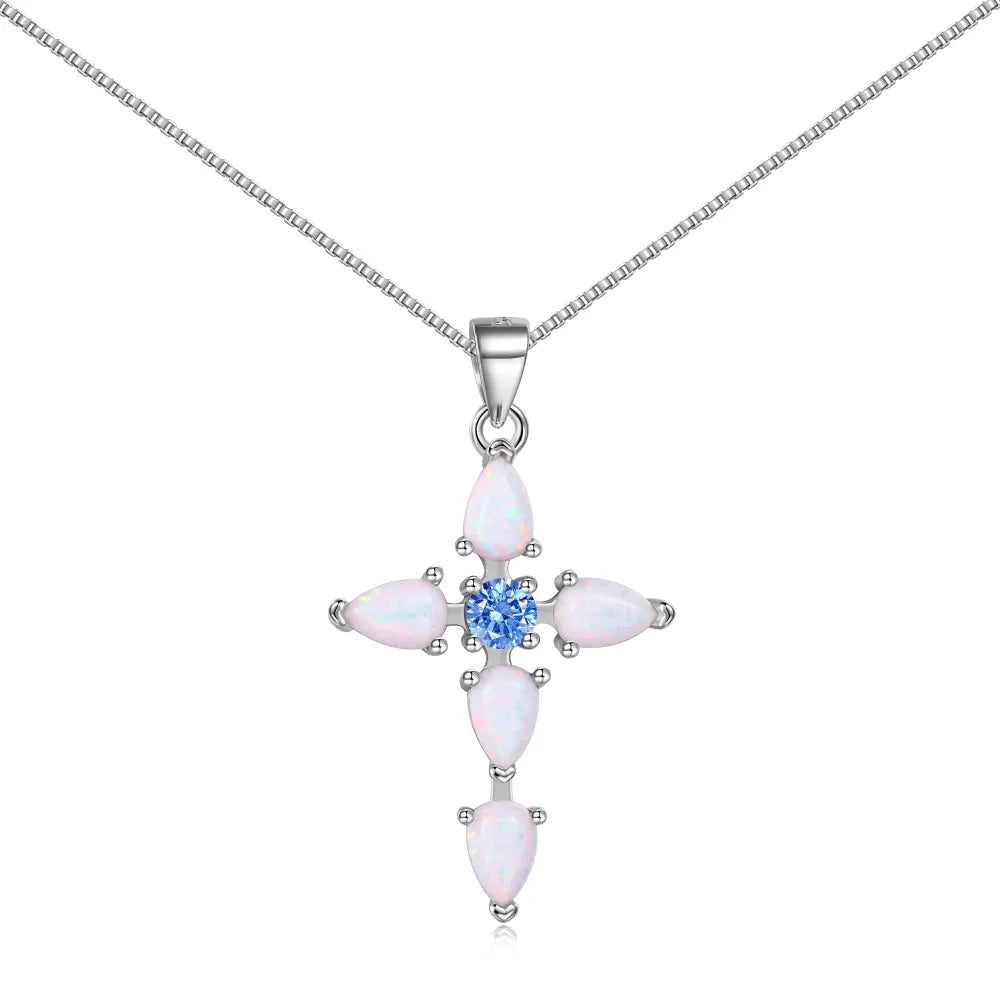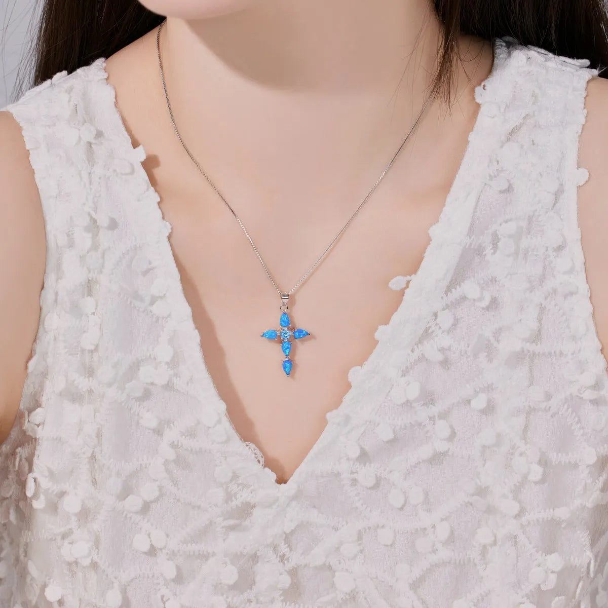 Aetolia Cz Zirconia Blue Fire Opal Cross Pendant Necklaces For Women S925 Silver Lucky Long Chain 18K Gold Plated Necklace Female