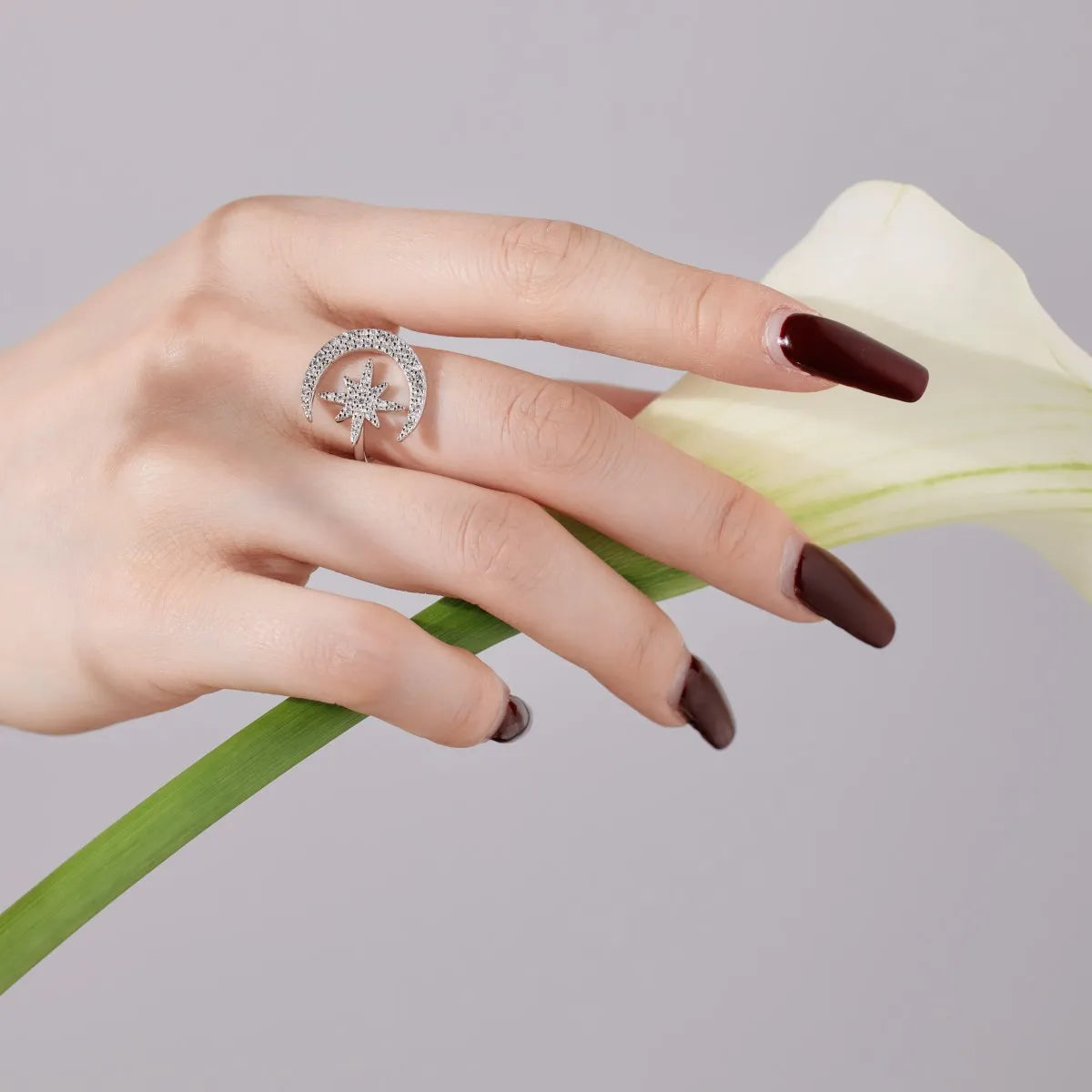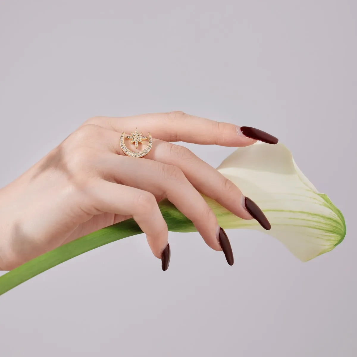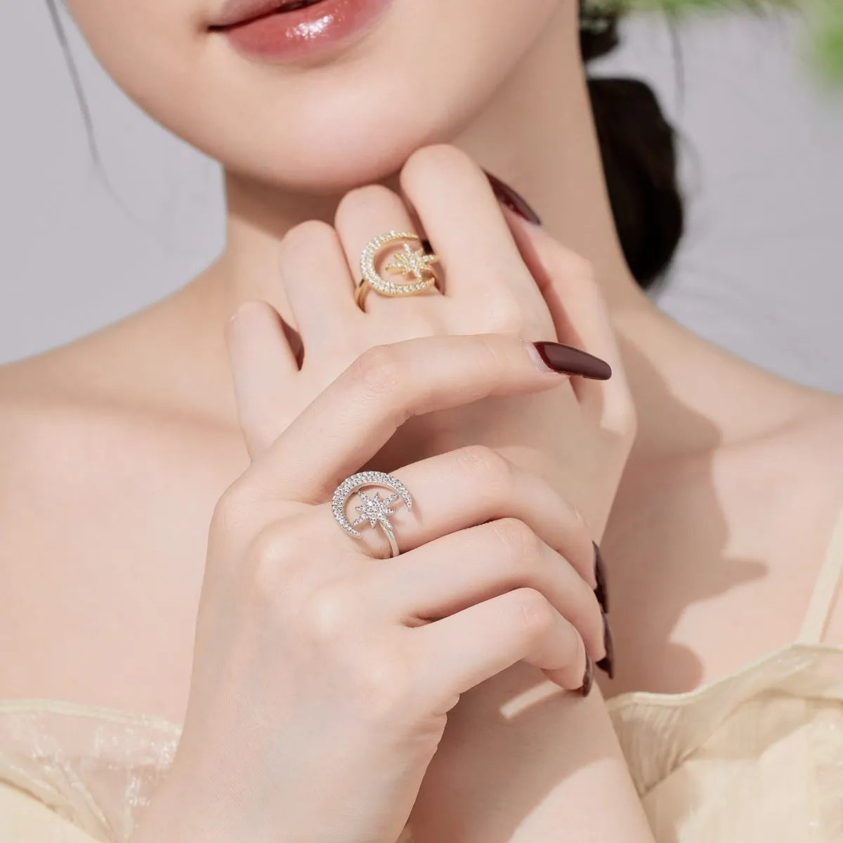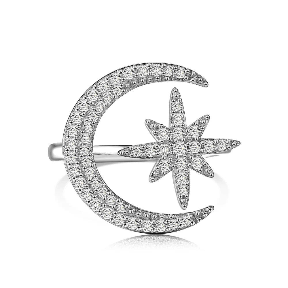 Aetolia High Quality Trendy Cubic Zirconia Crescent Moon And Star Ring 925 Sterling Silver 18K Gold Adjustable Rings Jewelry Women