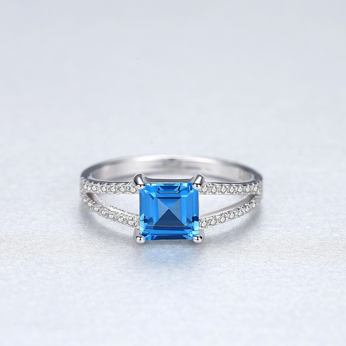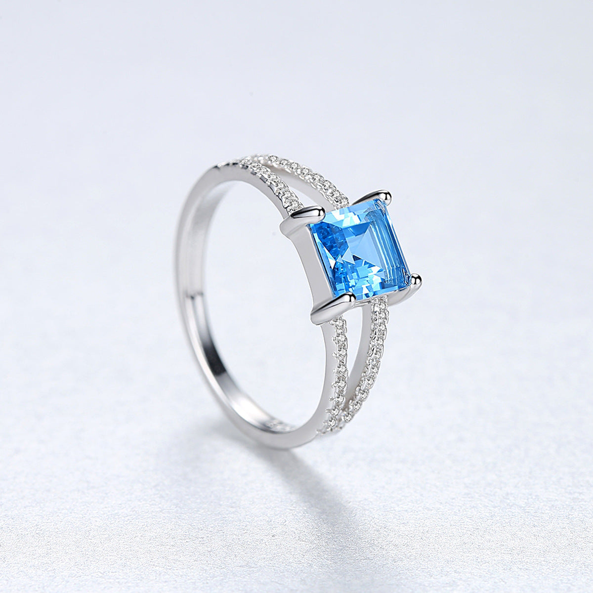 Aetolia 925 Sterling Silver 18K Gold Plated Ring Sky Blue Square Gemstone Double Row CZ Diamond Engagement Wedding Ring SR0079
