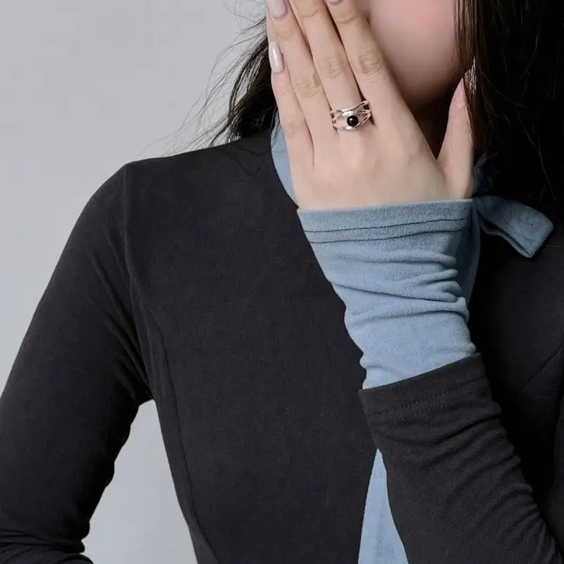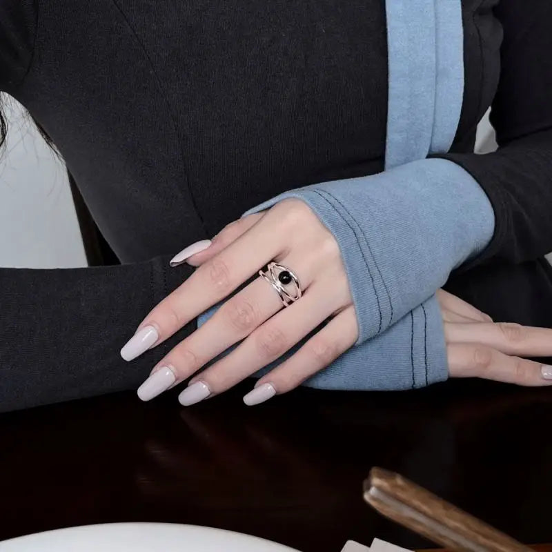Aetolia Exquisite In Stock S925 Sterling Silver Ring Double Layer Simple Style Black Agate Onyx Open Adjustable Rings For Women