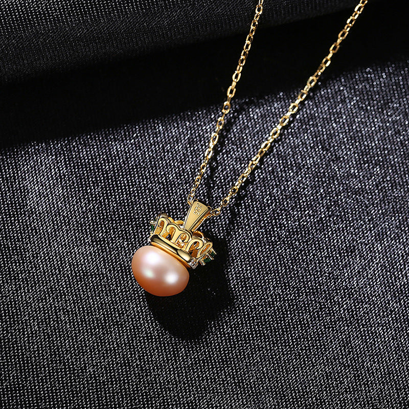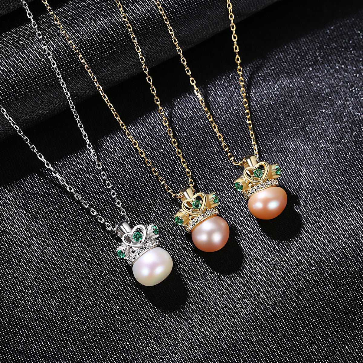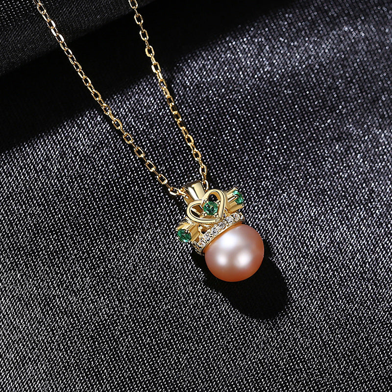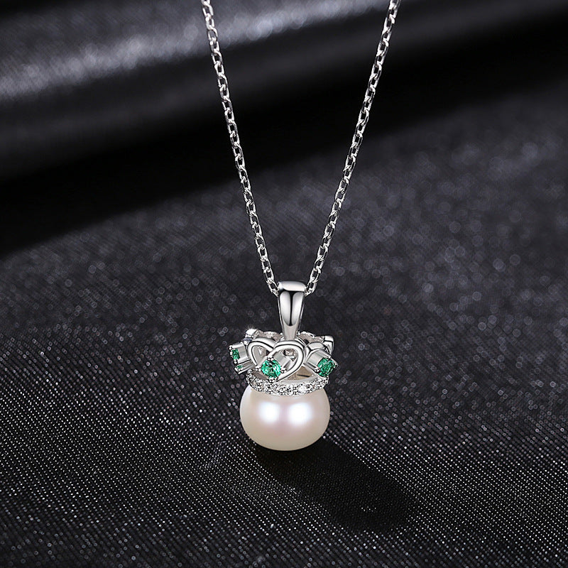 Aetolia 925 Sterling Silver Natural Freshwater Pearl Necklace Crown Green CZ Diamond Pendant Necklace FN-0217
