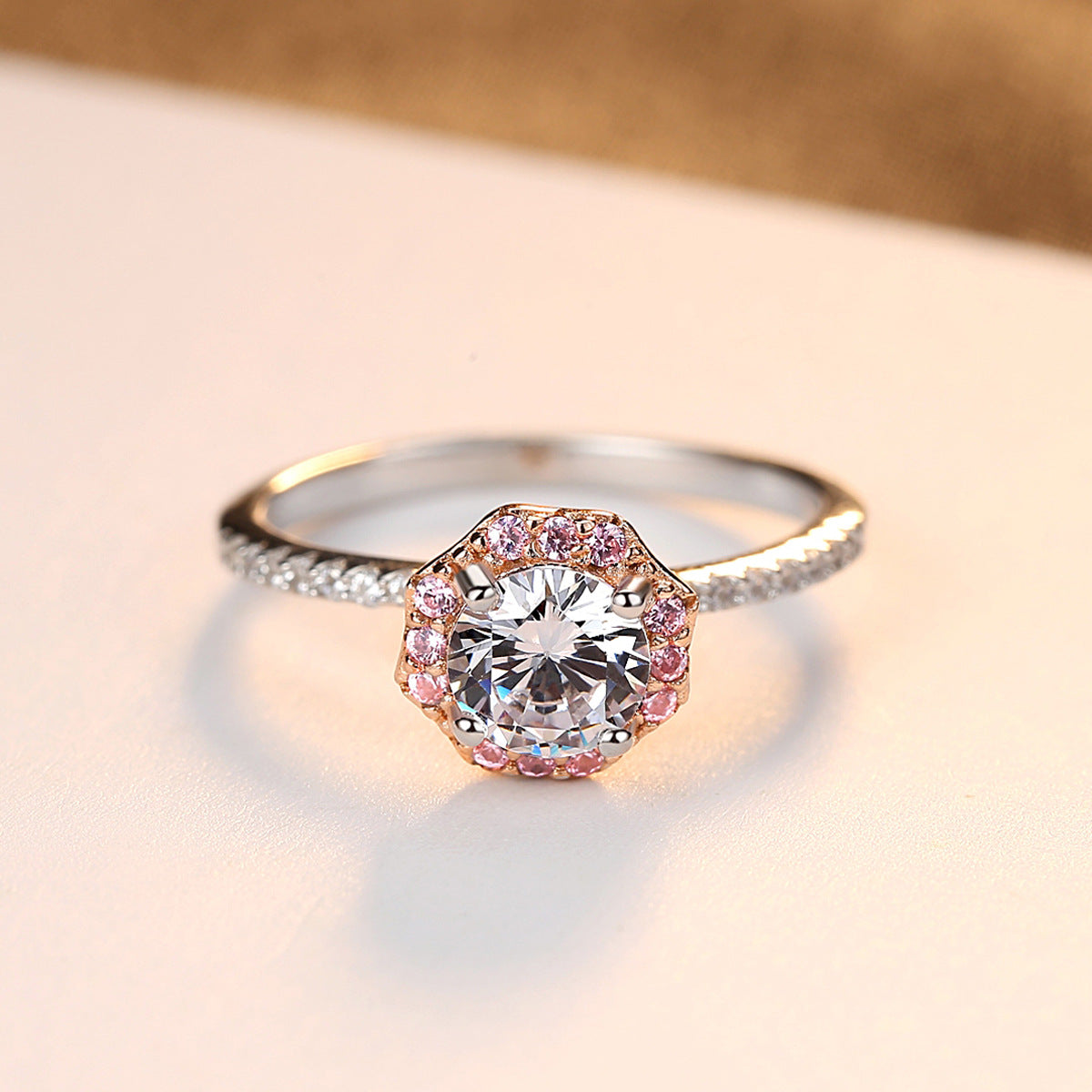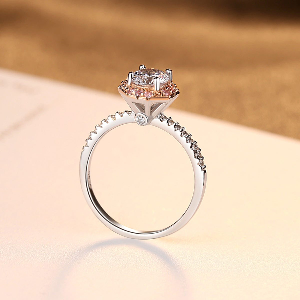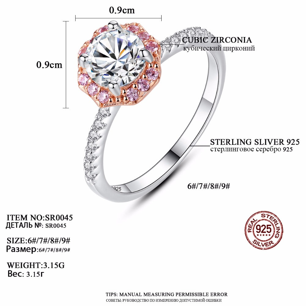 Aetolia 925 Sterling Silver 18K Gold Plated 4 Prong Solitaire Single Row Pink CZ Diamond Engagement Wedding Ring SR0053