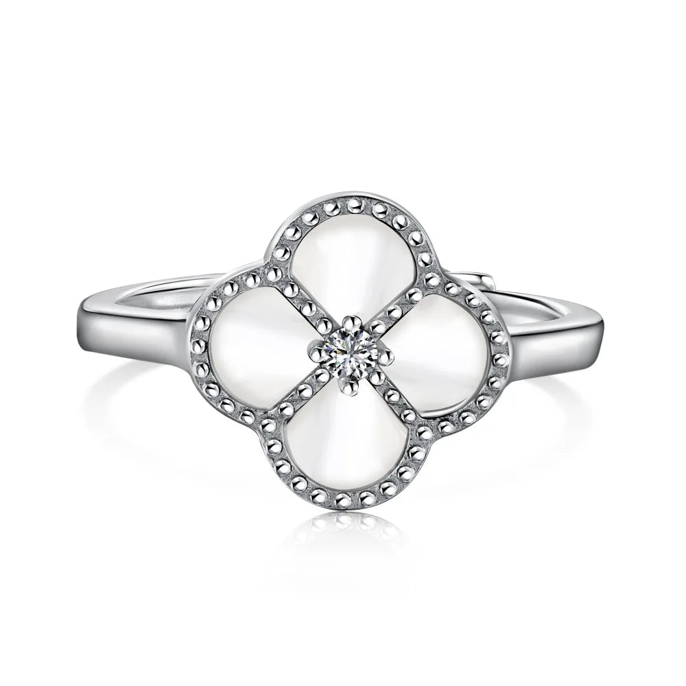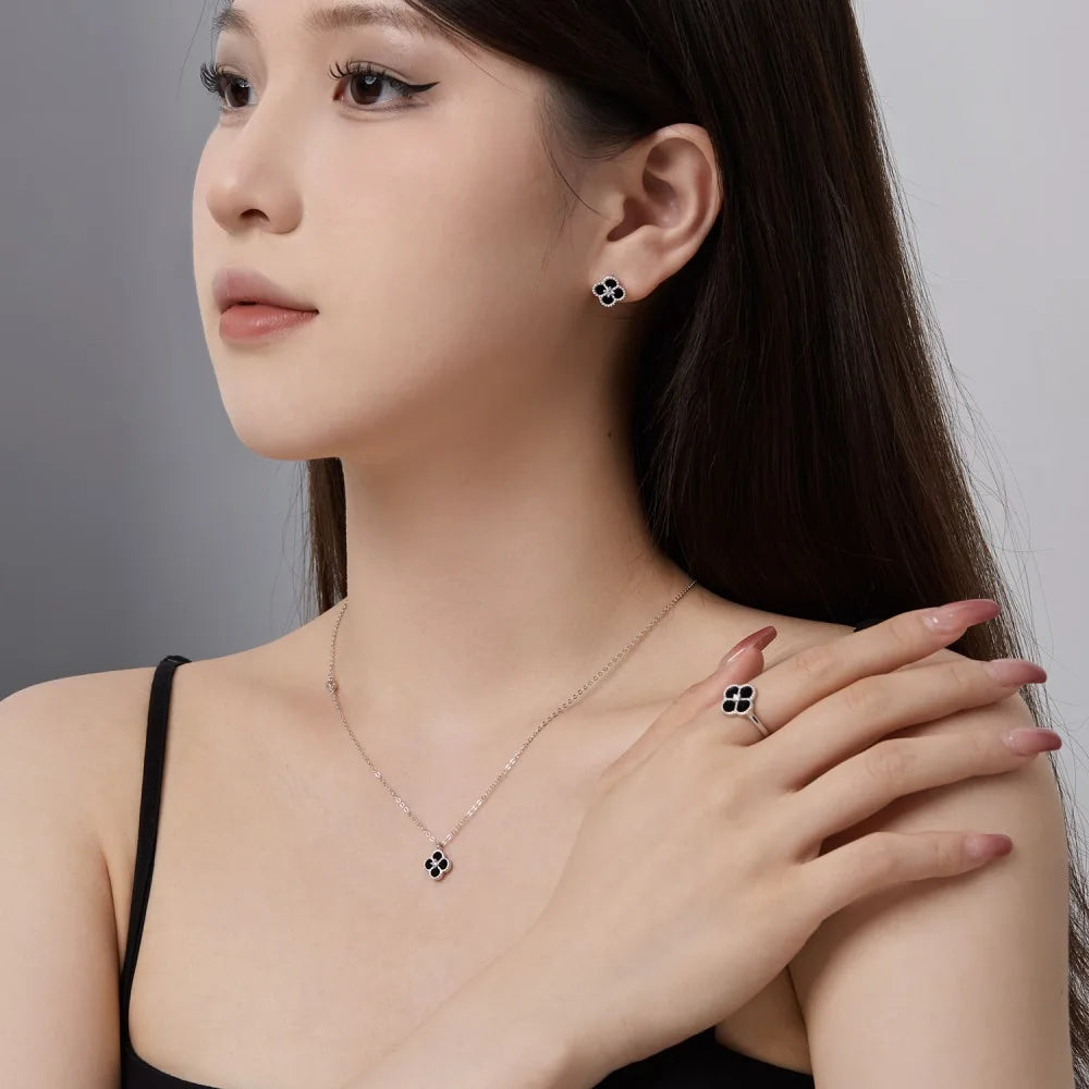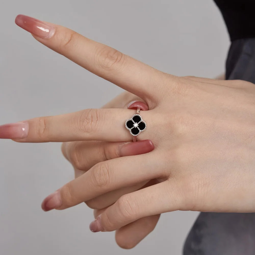 Aetolia Simple Black Agate Four-Leaf Clover Rings Jewelry Women Sterling Silver 925 Cz Cubic Zirconia Vintage Eternity Band Ring